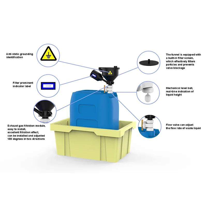 စွန့်ပစ်အရည်များ စုဆောင်းသည့်ကိရိယာတွင် ထူးထူးခြားခြား လက္ခဏာများရှိသည်။ ၎င်း၏စုဆောင်းမှုကွန်တိန်နာကို 10^5 မှ 10^9 အကွာအဝေးအတွင်း စွန့်ပစ်အရည်လမ်းကြောင်း၏ တည်ငြိမ်လျှပ်စစ်ဓာတ်အားကို ထိန်းချုပ်ပေးသည့် ပစ္စည်း၏တည်ငြိမ်မှုကို အာမခံရုံသာမက တည်ငြိမ်မှုကို အာမခံပေးသည့် anti-static PP ကုန်ကြမ်းပစ္စည်းများနှင့် ပြုလုပ်ထားသောကြောင့် တည်ငြိမ်လျှပ်စစ်မီးကြောင့်ဖြစ်ရသည့် ဘေးဥပဒ်အန္တရာယ်ကို များစွာလျှော့ချပေးပါသည်။ လမ်းကြောင်းသည် ဆန်းပြားသော ဒီဇိုင်းတစ်ခု ရှိသည်။ ယိုစိမ့်မှုဒဏ်ခံနိုင်သော ထိပ်တန်းကာဗာကို အလုံပိတ်အဖုံးနှင့် ရေပက်ခြင်းခံနိုင်သော စစ်ထုတ်သည့်လမ်းကြောင်းဖြင့် တွဲထားပြီး စွန့်ပစ်အရည်သိုလှောင်မှုဘေးကင်းစေရန်အတွက် လိုအပ်သလို အဆို့ရှင်ကို လိုအပ်သလို တပ်ဆင်နိုင်သည်။ တန်ပြန်အမျိုးအစား ထိပ်တန်းကာဗာသည် ပေါက်ကွဲခြင်းနှင့် အလိုအလျောက်လောင်ကျွမ်းခြင်းတို့ကို ရှောင်ကြဉ်ပြီး 100Pa တွင် အဖွင့်အတွင်းပိုင်းဖိအားအခြေအနေများနှင့်အညီ အိတ်ဇောဓာတ်ငွေ့ထုတ်လွှတ်မှုကို အလိုအလျောက်ချိန်ညှိပေးပါသည်။ အိတ်ဇောဓာတ်ငွေ့စစ်ထုတ်စက်ကို ခရုပတ်ပုံစံဖြင့် ချိတ်ဆက်ထားသောကြောင့် အစားထိုးရန်အတွက် အဆင်ပြေပြီး ဓာတုဗေဒအစိတ်အပိုင်းများ ပြိုလဲခြင်းမှ ကာကွယ်ပေးပါသည်။ အမျိုးမျိုးသော အိတ်ဇောဓာတ်ငွေ့ ကုသမှုများအတွက် တိကျသော လိုက်လျောညီထွေဖြစ်အောင် အမျိုးအစား ၅ မျိုးရှိပါသည်။